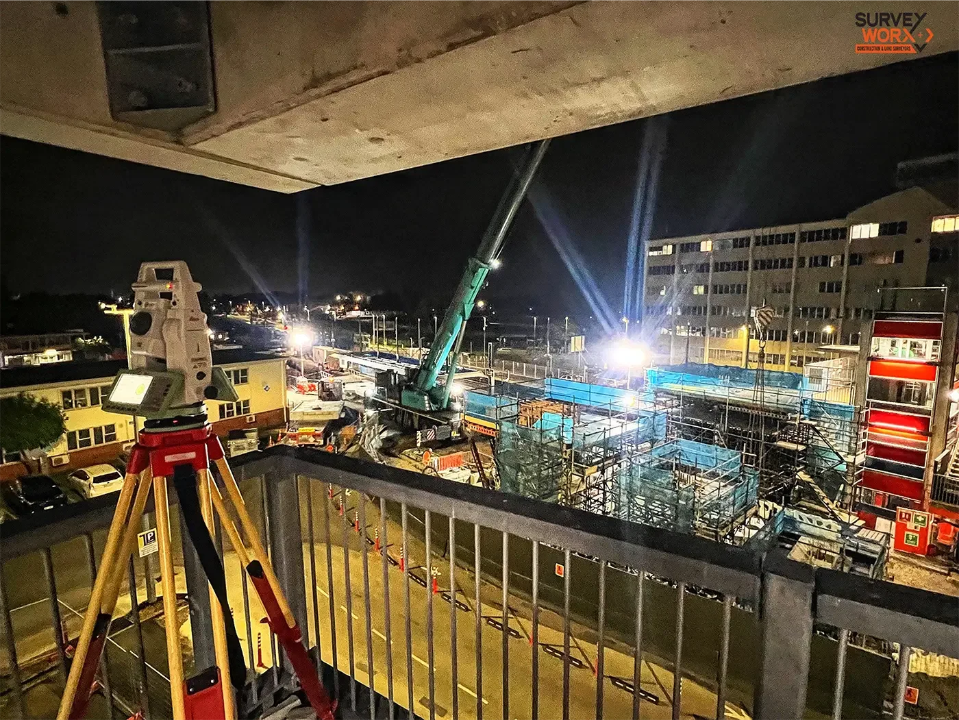 Night works at 37 Station Road, Papatoetoe for Downer, Task was to oversee 3 lifts of the head stocks onto 3 piers for a new foot bridge over the rail tracks at the station upgrade at Middlemore hospital. Set up on the 3rd floor of the car park to be able to view all 3 positions from 1 setup, we checked the positions and levels once they were in place.